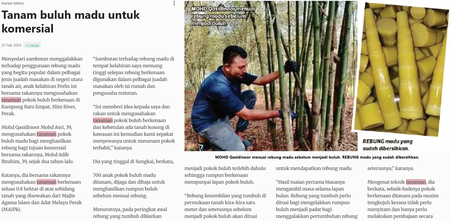 Harian Metro (2024) Tanam buluh madu untuk komersial. Harian Metro. |