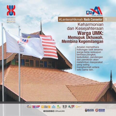 Keharmonian dan Kesejahteraan Warga UMK : Memupuk Ukhuwah, Membina Kegemilangan Assalamualaikum Warahmatullahi Wabarakatuh, Salam Malaysia MADANI dan Salam Kegemilangan UMK buat seluruh warga UMK sekalian. Buat pengetahuan semua, saya akan menggunakan platform ini sebagai saluran komunikasi langsung saya selaku Naib Canselor untuk menyampaikan peringatan, renungan, refleksi serta perkara-perkara yang bersesuaian untuk dikongsikan kepada semua. Saluran komunikasi ini akan berterusan setiap minggu dan pada kali ini Lentera Hikmah Naib Canselor #1 yang ingin dikongsikan adalah perihal Keharmonian dan Kesejahteraan Warga UMK : Memupuk Ukhuwah, Membina Kegemilangan. Antara kehilangan terbesar yang melanda umat akhir zaman pada hari ini ialah apabila adab dan akhlak tidak lagi menjadi pakaian serta perhiasan dalam kehidupan sesama insan. Perkara ini sentiasa diberi penekanan dalam segenap aspek kehidupan meliputi hubungan sesama manusia. Tuntutan sifat sopan atau bermoral terhadap warga UMK di tempat kerja adalah termasuk akhlak yang mulia. Amalan memelihara hubungan baik sesama warga kerja walaupun berbeza pangkat, kedudukan, pandangan dan pemikiran akan melahirkan masyarakat yang saling menghormati antara satu sama lain. Teguran boleh disampaikan kepada sesiapa sahaja, namun percakapan kasar dan merendah-rendahkan orang lain hendaklah dijauhi sebaliknya menegur dengan perkataan yang sesuai dan sopan. Menghormati maruah insan adalah suatu tuntutan yang perlu diamalkan namun perbuatan mengaibkan orang lain bukanlah menjadi sebahagian daripada adab dan akhlak yang sempurna. Sebaliknya perbuatan ini akan meninggalkan kesan moral dan gangguan psikologi yang mendalam. Rasulullah SAW bersabda “Seseorang Muslim adalah bersaudara bagi Muslim lainnya. Dia tidak menzaliminya dan tidak menyerahkannya (kepada musuh). Barang siapa membantu saudaranya dalam keperluan, Allah akan membantu keperluan dirinya. Barang siapa menghilangkan kesulitan seorang Muslim, Allah akan menghilangkan salah satu kesulitannya pada hari kiamat. Dan barang siapa menutupi aib seseorang Muslim, Allah menutupi aibnya pada hari kiamat”. (HR. Bukhari & Muslim) Hari ini merupakan hari pertama kita menyambut bulan Ramadan dan marilah sama-sama kita memperkukuhkan nilai-nilai murni, menyuburkan rasa kasih dan hormat antara satu sama lain serta terus membina UMK sebagai institusi yang harmoni, sejahtera dan penuh keberkatan. Saya mengambil kesempatan ini juga untuk mengucapkan Selamat Menunaikan Ibadah Puasa kepada seluruh warga UMK yang beragama Islam. Semoga segala amalan kita diterima, hati kita dipenuhi ketenangan, dan UMK terus teguh sebagai keluarga yang bersatu dalam keberkatan. Ikhlas daripada ; Arham Abdullah |