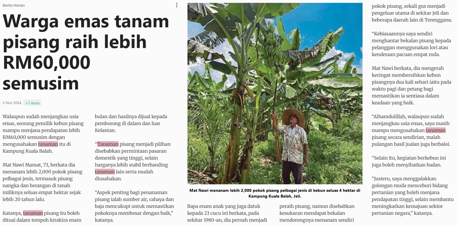 Berita Harian (2024) Warga emas tanam pisang raih lebih rm60,000 semusim. Berita Harian. |