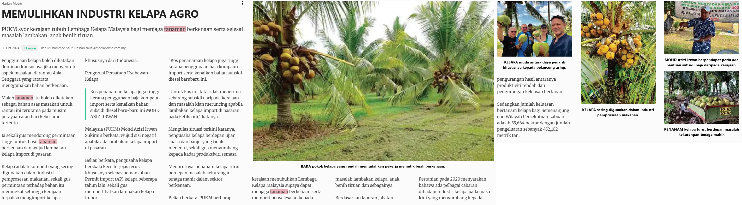 Muhammad Saufi Hassan (2024) Memulihkan industri kelapa agro. Harian Metro. |