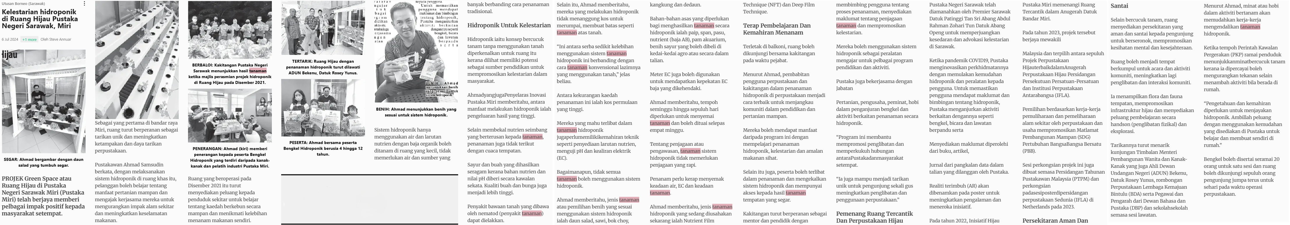 Steve Annuar (2024) Kelestarian hidroponik di Ruang Hijau Pustaka Negeri Sarawak, Miri. Utusan Borneo (Sarawak). |