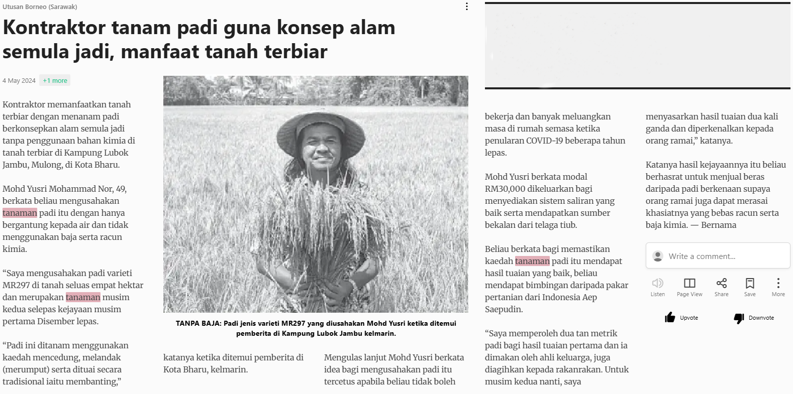 Bernama (2024) Kontraktor tanam padi guna konsep alam semula jadi, manfaat tanah terbiar. Utusan Borneo (Sarawak). |