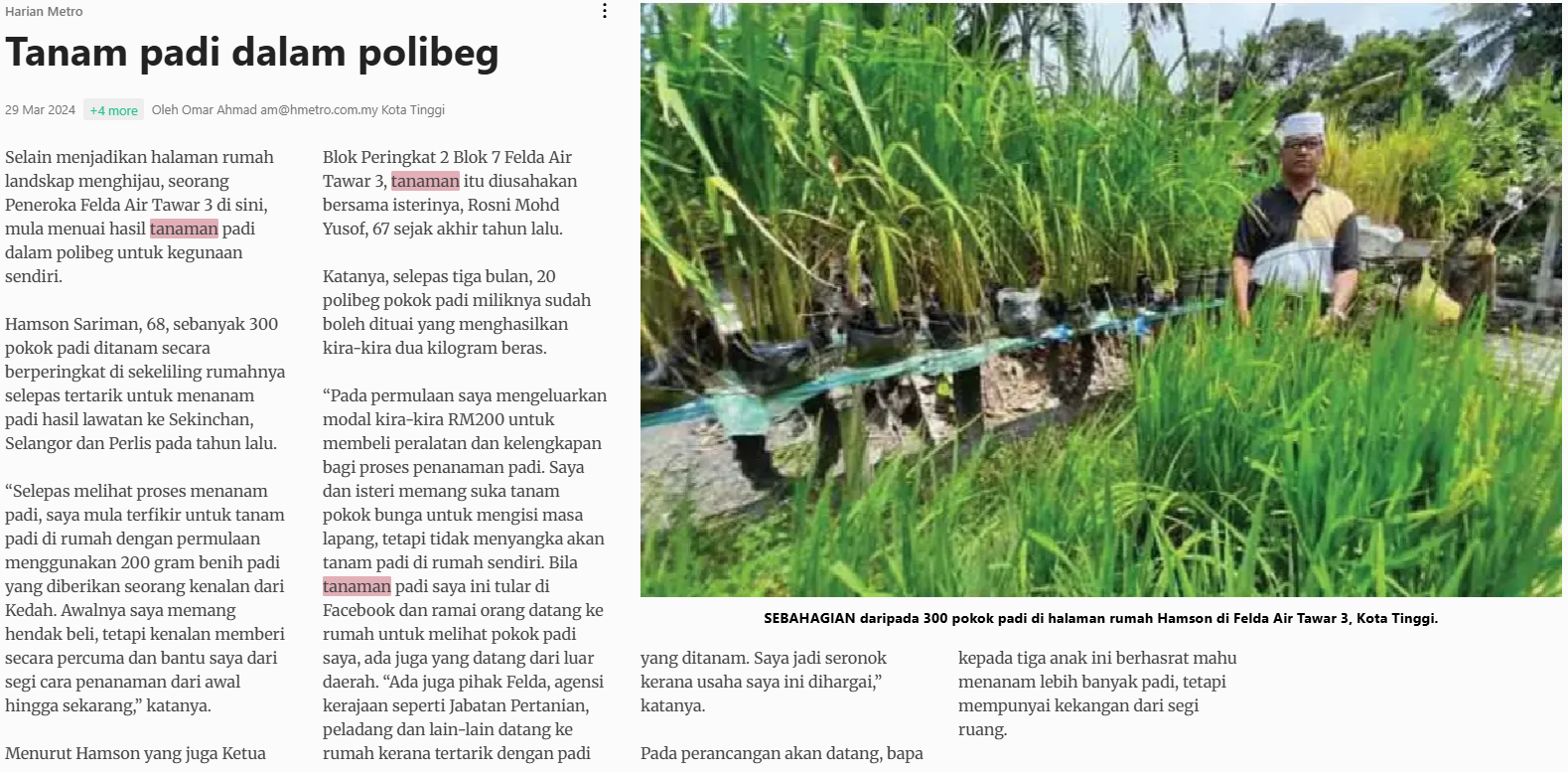 Omar Ahmad (2024) Tanam padi dalam polibeg. Harian Metro. |