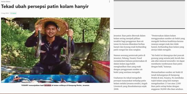 Harian Metro (2024) Tekad ubah persepsi patin kolam hanyir. Harian Metro. |