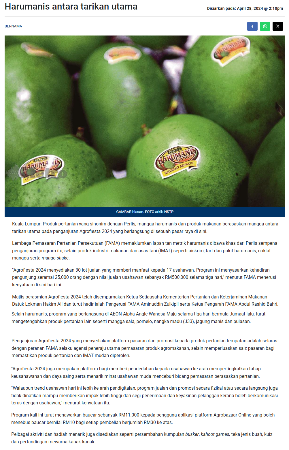Bernama (2024) Harumanis antara tarikan utama. Harian Metro. |