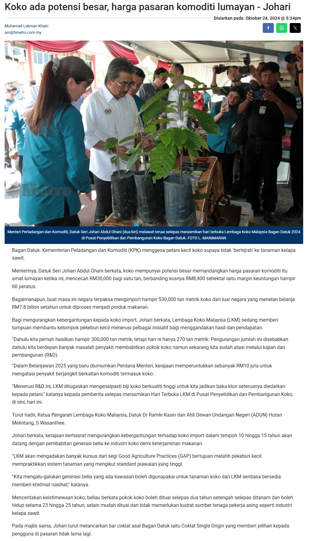 Muhamad Lokman Khairi (2024) Koko ada potensi besar, harga pasaran komoditi lumayan - Johari. Harian Metro. |
