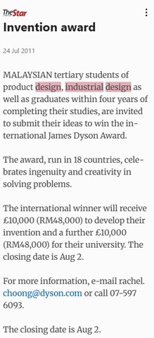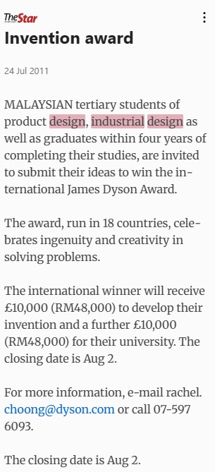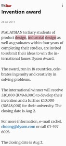 The Star Malaysia (2011) Invention award. The Star Malaysia. |