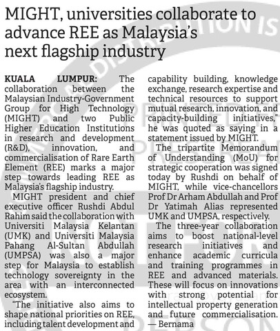 The Borneo Post (Sabah) (2025) MIGHT, universities collaborate to advance REE as Malaysia’s next flagship industry. The Borneo Post (Sabah). |