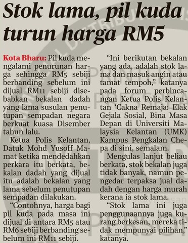 Harian Metro (2025) Stok lama, pil kuda turun harga RM5. Harian Metro. |