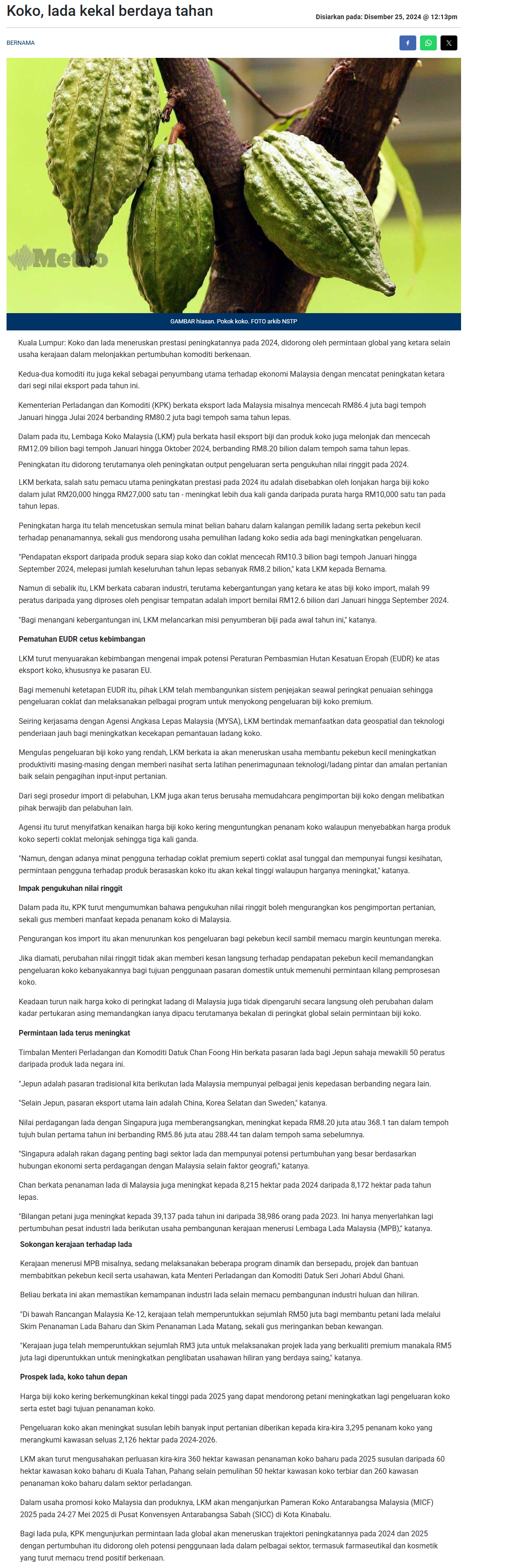 Bernama (2024) Koko, lada kekal berdaya tahan. Harian Metro. |