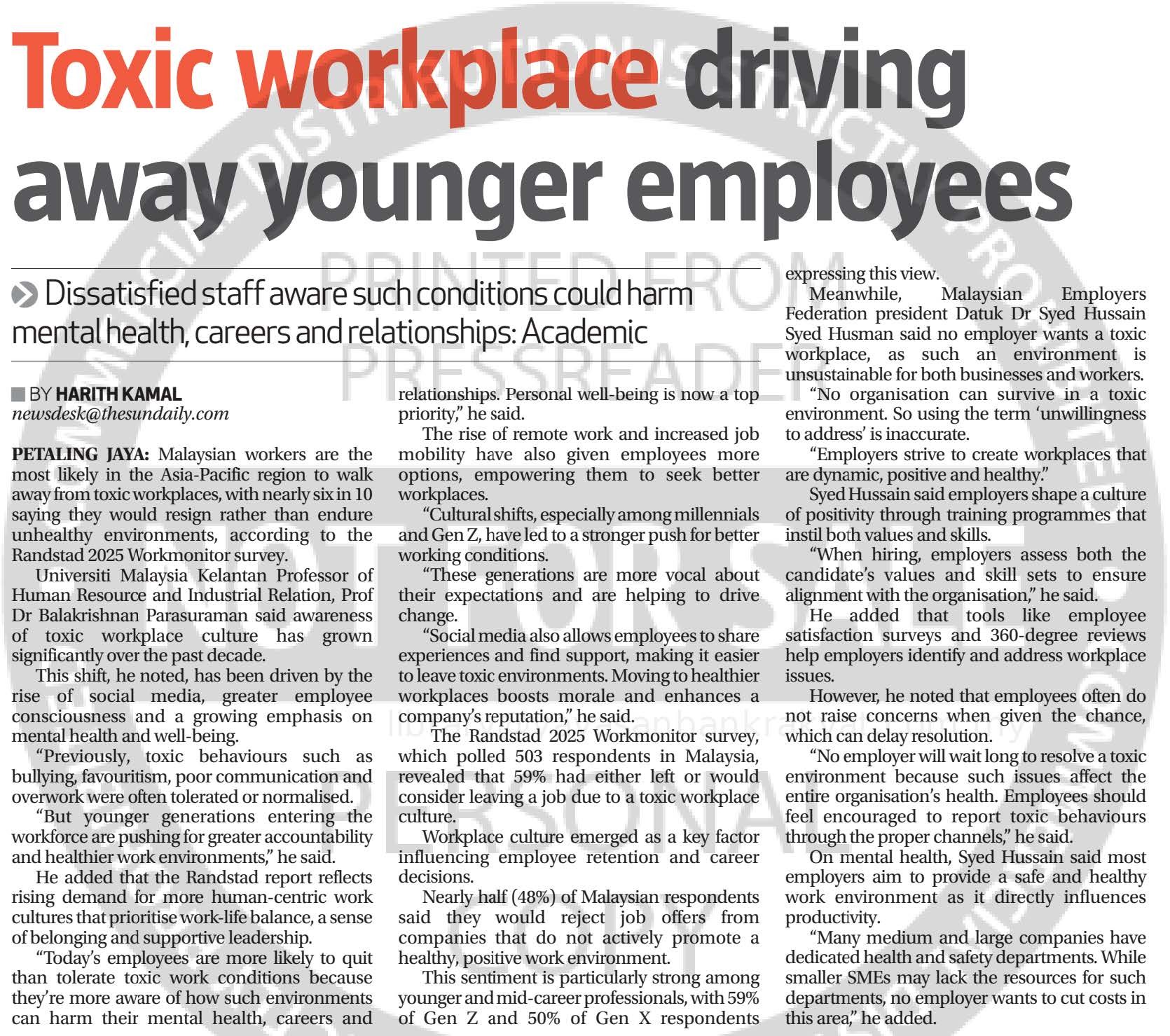 Kamal, Harith (2025) Toxic workplace driving away younger employees. The Sun (Malaysia). |