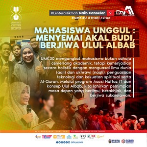 MAHASISWA UNGGUL : MENYEMAI AKAL BUDI, BERJIWA ULUL ALBAB Assalamualaikum Warahmatullahi Wabarakatuh, Salam Malaysia MADANI, dan Salam UMK4U, 1 Hati 1 Jiwa kepada seluruh warga UMK yang saya kasihi sekalian. Universiti Malaysia Kelantan (UMK) sentiasa berpegang pada prinsip bahawa pendidikan yang benar-benar bermakna adalah pendidikan yang mampu membentuk sahsiah, intelek dan spiritual mahasiswa secara menyeluruh atau disebut mahasiswa holistik. Pendekatan ini digariskan bagi memastikan pelajar UMK bukan sahaja cemerlang dalam bidang akademik mahupun kemahiran, tetapi juga memiliki kekuatan rohani dan nilai akhlak yang tinggi. Sepertimana yang telah saya sebutkan dalam Lentera Hikmah #8 sebelum ini, saya akan memperincikan 14 langkah quick wins yang terkandung dalam UMK30 secara berperingkat setiap minggu melalui siri LenteraHikmah. Minggu ini, melalui Lentera Hikmah #9, saya ingin mengetengahkan Langkah Strategik #2 berkenaan dengan usaha menjadikan mahasiswa UMK bukan sahaja cemerlang dalam akademik, tetapi juga berkembang secara holistik. Hasrat ini dimeterai dalam pelaksanaan UMK30 yang memberi tumpuan kepada kemenjadian pelajar secara seimbang, dengan menggabungkan ilmu dunia (Aqli) dan ilmu ukhrawi (Naqli). Pendekatan ini turut diterjemahkan melalui penubuhan Pusat Pengajian Asasi yang mengendalikan Program Asasi Teknologi Maklumat Huffaz di Kampus Jeli. Program ini bakal menjadi pencetus transformasi dalam sistem pendidikan UMK, dengan memberi penekanan kepada keseimbangan antara penguasaan teknologi dan kekuatan spiritual. Saya yakin, melalui pendekatan ini, kita mampu melahirkan mahasiswa yang berpengetahuan luas, menguasai Al-Quran, Sunnah serta teknologi terkini, dan seterusnya bersedia memimpin perubahan. Ini adalah antara strategi “game changer” kepada pembentukan jati diri mahasiswa UMK agar tampil lebih unggul. Sabda Rasulullah S.A.W.: "Sebaik-baik kamu adalah mereka yang mempelajari al-Quran dan mengajarkannya." (Hadith Sahih Bukhari) Konsep Ulul Albab akan menjadi asas kepada perubahan ini. Bermula dengan pelajar Program Asasi Teknologi atau Huffaz IT, konsep ini akan diperluas kepada semua mahasiswa UMK secara berperingkat tidak terkecuali kepada mahasiswa-mahasiswa yang lain. Dalam membentuk mahasiswa unggul, pencapaian akademik bukan satu-satunya ukuran. Kemahiran insaniah (soft skill) seperti kepimpinan, komunikasi berhemah, kemahiran berfikir secara kreatif dan kritis, keprihatinan terhadap isu sejagat serta keupayaan menyumbang kepada masyarakat turut menjadi keutamaan. Inilah antara elemen penting dalam membentuk akal budi mahasiswa holistik yang kita impikan. Saya juga berhasrat untuk memastikan semua pelajar UMK didedahkan dengan teknologi AI dan “Big Data Analytic” yang sebahagian daripadanya adalah elemen kemenjadian pelajar secara holistik. Selaras dengan itu, segala program dan aktiviti yang dirancang perlu menerapkan nilai keilmuan, semangat kesukarelawanan serta memberi impak tinggi bagi melahirkan mahasiswa yang menzahirkan ciri-ciri Ulul Albab. Komitmen ini akan terus dizahirkan melalui pelaksanaan inisiatif yang berteraskan pembangunan sahsiah, pengukuhan jati diri, serta pemerkasaan nilai keilmuan dan kepimpinan mahasiswa. Dengan sokongan semua pihak, saya percaya UMK mampu melahirkan barisan graduan yang bukan sahaja berilmu dan berakhlak, tetapi turut menjadi agen perubahan yang menyumbang secara signifikan kepada kemajuan negara dan kesejahteraan ummah. MADANI yang berdaya saing. Sekian, terima kasih. Ikhlas daripada ; Arham Abdullah |