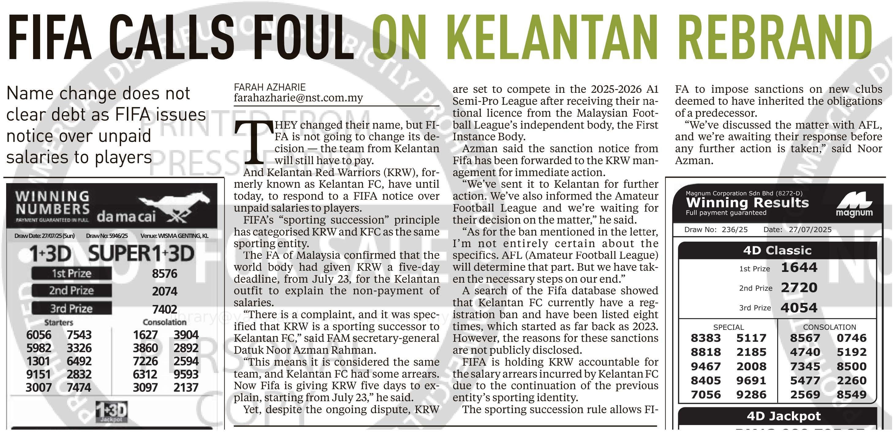 Farah Azharie (2025) FIFA CALLS FOUL ON KELANTAN REBRAND. New Straits Times. |