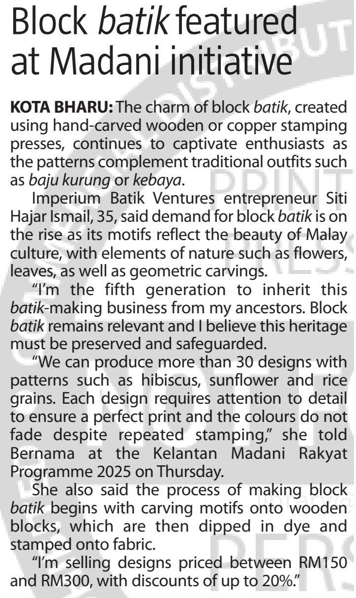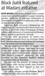 The Sun (Malaysia) (2025) Block batik featured at Madani initiative. The Sun (Malaysia). |