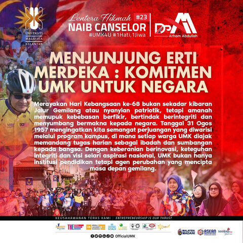 MENJUNJUNG ERTI MERDEKA : KOMITMEN UMK UNTUK NEGARA Assalamualaikum Warahmatullahi Wabarakatuh, Salam Malaysia MADANI dan Salam UMK4U 1 Hati 1 Jiwa kepada seluruh warga UMK. Kemerdekaan tidaklah terhad kepada kibaran Jalur Gemilang, nyanyian lagu patriotik mahupun keraian di peringkat jabatan atau kebangsaan. Ia adalah cerminan sejauh mana kita bebas berfikir dengan bijaksana, bertindak dengan nilai dan menyumbang secara bermakna kepada negara. Kemerdekaan ialah amanah. Tidak cukup untuk diletak hanya sekadar warisan sejarah, tetapi ia tanggungjawab sepanjang zaman. Sempena Sambutan Hari Kebangsaan Ke-68 yang diraikan pada tahun ini, saya bersama pihak pengurusan universiti telah merancang pelbagai program bagi memastikan semangat cintakan negara dan cintakan perpaduan terus mekar dalam kalangan warga kampus. Sejarah telah meninggalkan 1001 kenangan yang harus generasi hari ini ingati seperti mana perjuangan anak melayu pada suatu ketika dahulu iaitu Tunku Abdul Rahman Putra Al-Haj yang telah menaikkan semangat perjuangan penduduk Tanah Melayu sehingga membawa kepada Kemerdekaan Persekutuan Tanah Melayu pada 31 Ogos 1957. Juateru, atas semangat dan prinsip kerja hari ini, saya menyeru kepada seluruh warga kampus agar tidak melihat tugasan harian sebagai rutin semata mata malah ia juga adalah sebagai ibadah dan sumbangan kepada pembinaan negara bangsa. Kita tidak boleh lagi hanya bertanya apa yang negara beri kepada kita tetapi harus juga bertanya apakah pula sumbangan kita kepada negara. Semangat kemerdekaan mesti terpancar dalam setiap tindakan kita dalam cara kita bekerja, berfikir dan membuat keputusan. Kita perlu berani berinovasi dan memimpin dengan penuh integriti. Inilah perjuangan masa kini. UMK akan sentiasa menyahut amanah ini dengan penuh tekad. Kita tidak mahu dijulang hanya kerana mengenang perjuangan lampau sebaliknya terus menyambungnya dengan visi dan tindakan berdasarkan aspirasi nasional. Marilah kita buktikan bahawa UMK bukan sekadar institusi pendidikan, tetapi agen perubahan yang memberi impak kepada masyarakat dan negara. Tunjukkan kesetiaan kita kepada tanah air, kerana kitalah pewaris kemerdekaan dan pencipta masa depan yang lebih gemilang. Sekian, terima kasih. Ikhlas daripada, Arham Abdullah |