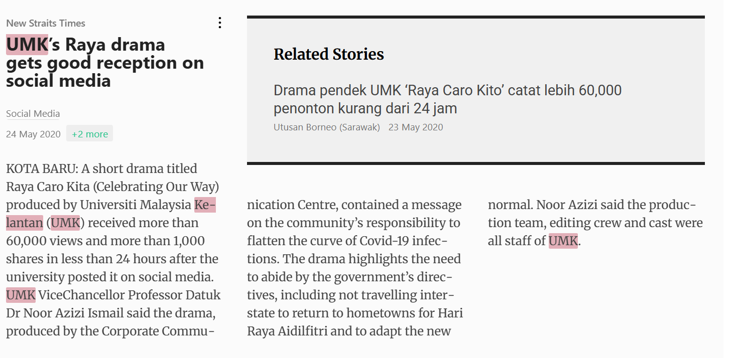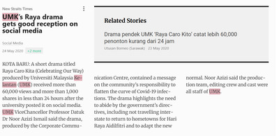 New Straits Times (2020) UMK’s Raya drama gets good reception on social media. New Straits Times. |