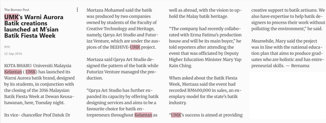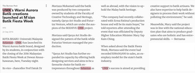 The Borneo Post (2016) UMK’s Warni Aurora Batik creations launched at M’sian Batik Fiesta Week. The Borneo post. |
