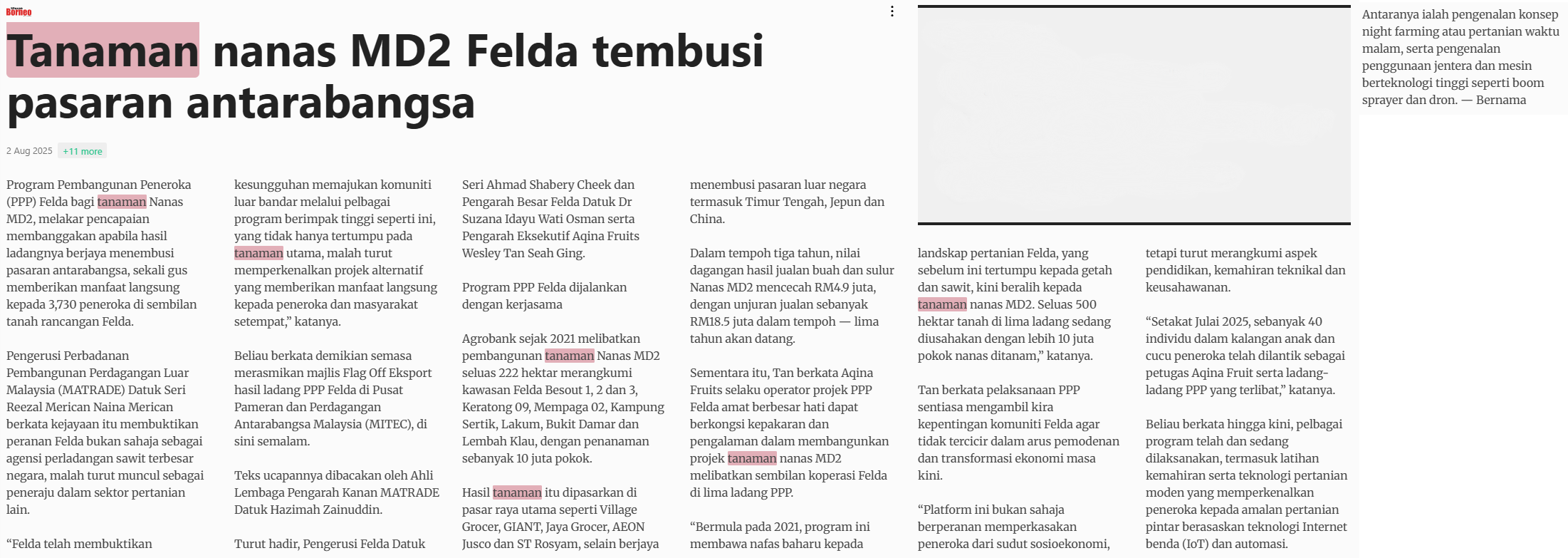 Bernama (2025) Tanaman nanas MD2 Felda tembusi pasaran antarabangsa. Utusan Borneo (Sabah). |