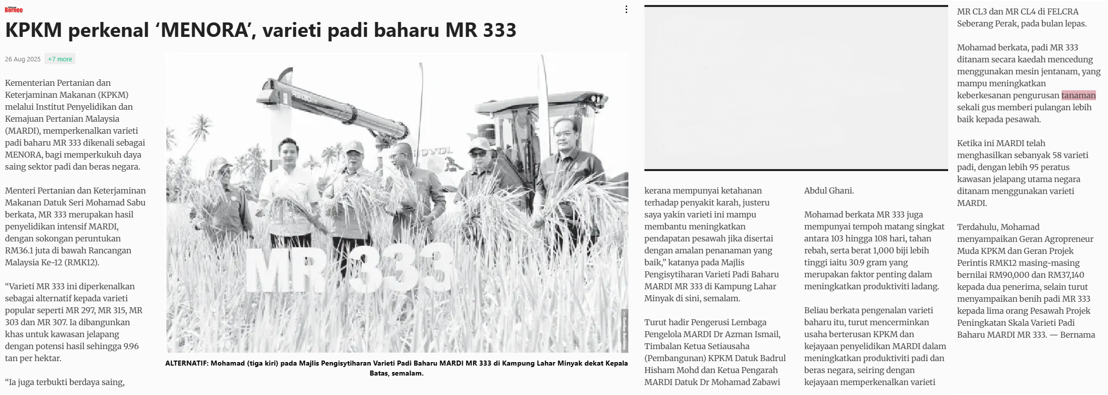 Bernama (2025) KPKM perkenal 'MENORA',varieti padi baharu MR 333. Utusan Borneo (Sabah). |