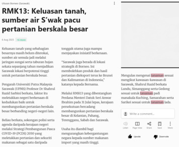 Utusan Borneo (Sarawak) (2025) RMK13: keluasan tanah, sumber air S'wak pacu pertanian berskala besar. Utusan Borneo (Sarawak). |