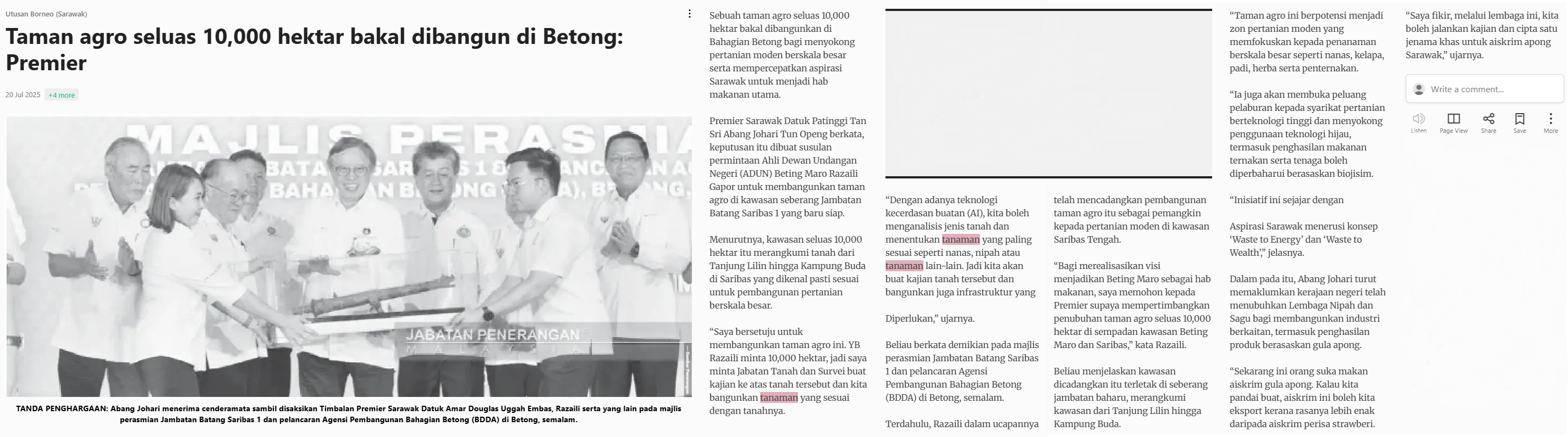 Utusan Borneo (Sarawak) (2025) Taman agro seluas 10,000 hektar bakal dibangun di betong: Premier. Utusan Borneo (Sarawak). |