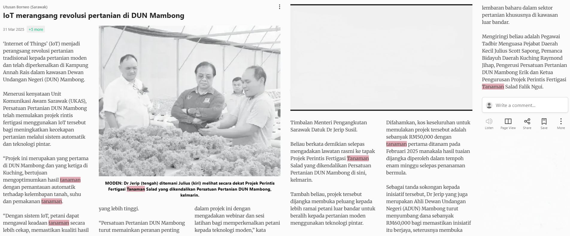 Utusan Borneo (Sarawak) (2025) IoT merangsang revolusi pertanian di dun Mambong. Utusan Borneo (Sarawak). |