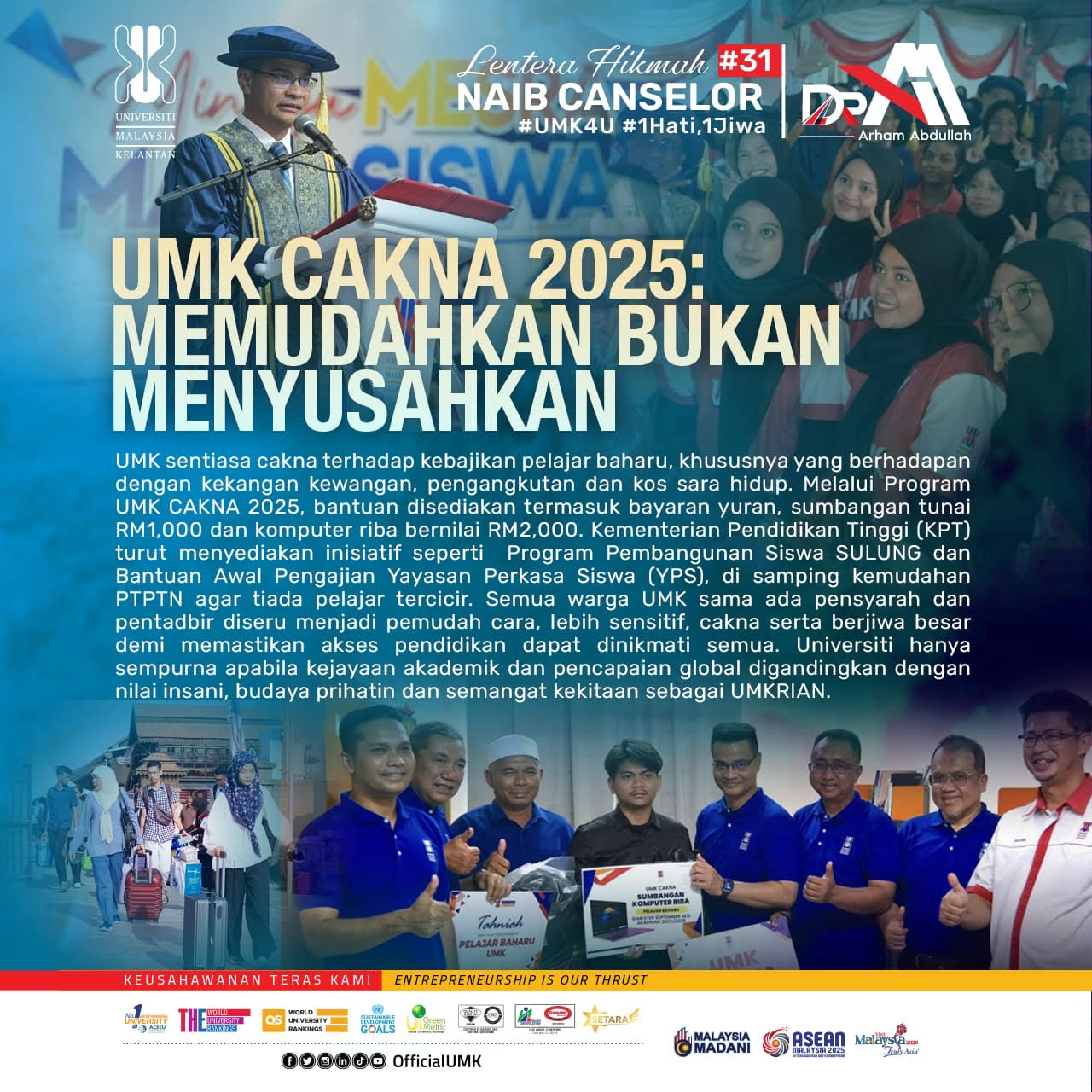 UMK CAKNA 2025: MEMUDAHKAN BUKAN MENYUSAHKAN Assalamualaikum Warahmatullahi Wabarakatuh, Salam Malaysia MADANI dan Salam UMK4U 1 Hati 1 Jiwa kepada seluruh warga UMK yang saya kasihi. Minggu lalu, saya berpeluang menyambut pelajar baharu di kampus dan turut meninjau proses pendaftaran yang berlangsung. Ada yang datang dari jauh, ada yang meninggalkan keluarga buat pertama kali, dan tidak kurang juga yang hampir-hampir tidak mendaftar kerana kekangan kewangan. Sejak keputusan UPU diumumkan, UMK mengambil langkah proaktif untuk mengenal pasti pelajar yang berhadapan dengan kesusahan, sama ada kerana tidak mampu membayar yuran pendaftaran dan pengajian, kekangan pengangkutan untuk hadir sesi pendaftaran di kampus, atau memikirkan kos sara diri sepanjang pengajian. Sebagai warga universiti yang prihatin, kita mesti peka dan sentiasa sensitif terhadap isu kebajikan yang melibatkan pelajar kerana mereka adalah sebahagian daripada pemegang taruh utama di universiti. Semasa sesi pendaftaran baru-baru ini, saya melihat ada dalam kalangan mereka yang datang dari jauh dengan perjalanan berhari-hari lamanya hanya kerana mahu menuntut ilmu. Ada juga yang datang dari keluarga susah, datang sehelai sepinggang demi sebuah cita-cita. Apakah kita sanggup melihat mereka berjuang sendirian sedangkan mereka juga adalah sebahagian daripada kita? Dalam konteks ini, UMK sentiasa bersedia untuk menghulurkan bantuan dan sokongan kepada mereka melalui Program UMK CAKNA 2025. Antara jenis bantuan yang disediakan ialah bayaran yuran pengajian, sumbangan tunai berjumlah RM1,000.00 dan sumbangan komputer riba bernilai RM2,000.00. Pihak Kementerian Pendidikan Tinggi (KPT) turut menyediakan pelbagai jenis bantuan kewangan antaranya Program Pembangunan Siswa SULUNG dan Bantuan Awal Pengajian Yayasan Perkasa Siswa (YPS). Menteri Pendidikan Tinggi, YB Datuk Seri Dr. Zambry Abd Kadir di media sebelum ini turut menegaskan bahawa semua pentadbir universiti mesti menerima masuk pelajar miskin dan memastikan pelajar tersebut mendaftar masuk terlebih dahulu. Pihak universiti juga mestilah menguruskan bantuan awal pengajian melalui PTPTN bagi pelajar tidak berkemampuan agar setiap mahasiswa yang ditawarkan tempat ke universiti tidak terlepas peluang meneruskan pendidikan. Sebagai warga UMK, sama ada pensyarah mahupun pentadbir, saya menyeru agar kita semua lebih sensitif, berjiwa besar, dan sentiasa cakna dalam membantu serta memudah cara setiap pemegang taruh kita. Kita adalah pemudah cara yang dilantik oleh Kerajaan untuk menyantuni rakyat berdasarkan prinsip integriti, ketelusan, dan keprihatinan. Apalah gunanya kita meraih pelbagai kejayaan sekiranya kita lupa pada nilai insani, ihsan dan keprihatinan. Universiti tidak akan pernah lengkap dengan hanya bangunan megah, kurikulum hebat atau kedudukan ranking yang membanggakan. Ia hanya akan sempurna apabila seluruh warganya hidup dalam budaya cakna, prihatin dan saling peduli. Kepada semua pelajar baharu, saya ucapkan selamat datang ke Keluarga UMK. Kepada pelajar perdana, selamat kembali ke kampus untuk meneruskan jihad kalian sehingga bergraduasi. Kepada semua staf UMK, kalianlah wira yang mungkin tidak didendang, tetapi setiap titik peluh dan usaha kalian adalah nadi yang menggerakkan universiti ini ke hadapan. Sebagai penutup, izinkan saya menekankan bahawa kita semua adalah UMKRIAN iaitu satu identiti yang menyatukan pelajar semasa mahupun alumni, staf akademik dan pentadbiran, serta seluruh komuniti kampus. Sebutan ini menzahirkan semangat kekitaan, keprihatinan dan kebanggaan kita sebagai sebahagian daripada keluarga besar UMK. Marilah kita terus membina legasi UMK bukan sahaja dengan pencapaian akademik dan kedudukan global, tetapi juga dengan budi, hati dan jiwa yang sentiasa mendahulukan insan lain. Sekian, terima kasih. Ikhlas, |