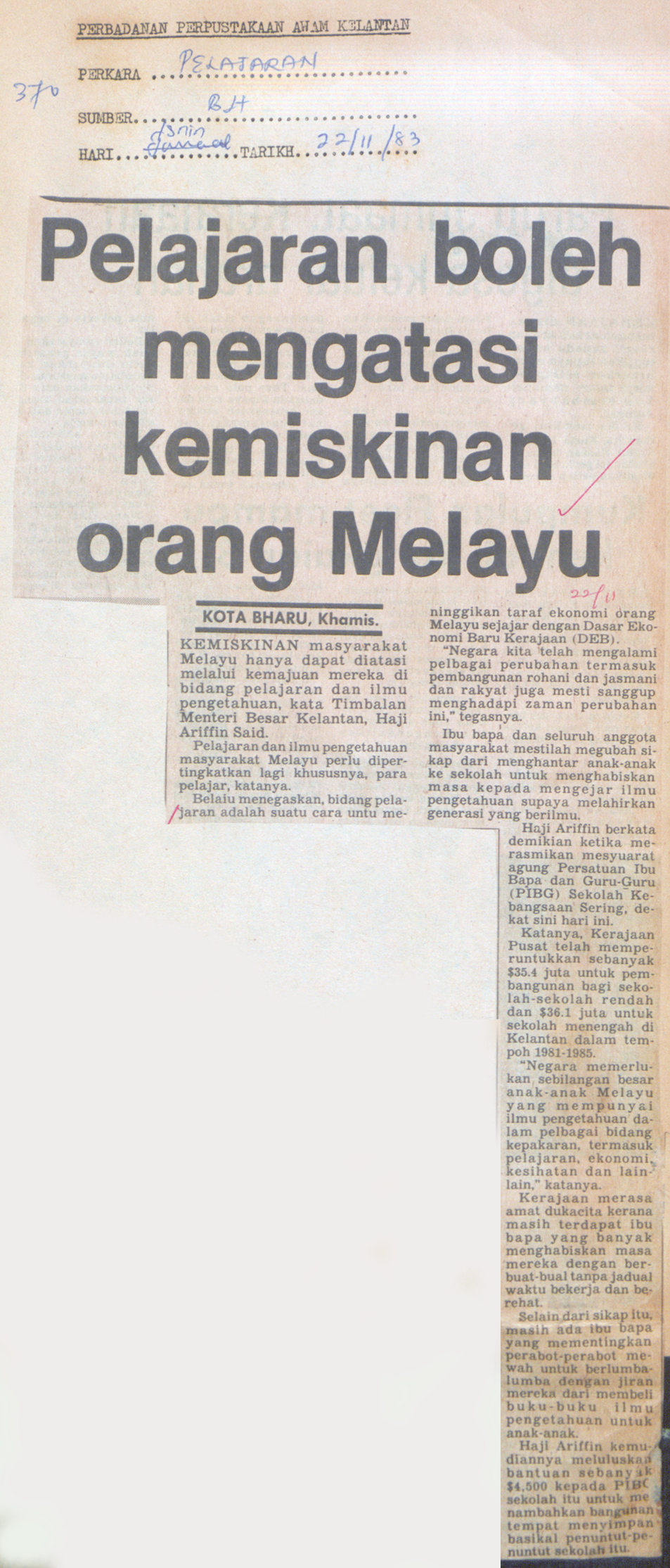 Berita Harian (1983) Pelajaran boleh mengatasi kemiskinan orang Melayu. Berita Harian. |