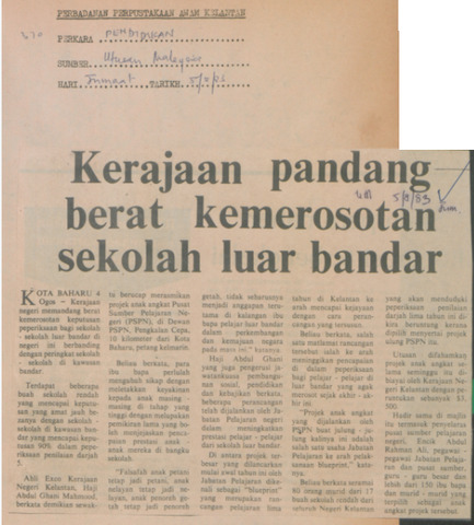 Utusan Malaysia (1983) Kerajaan pandang berat kemerosotan sekolah luar bandar. Utusan Malaysia. |