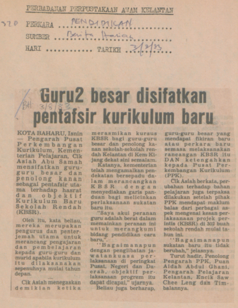 Berita Harian (1983) Guru2 besar disifatkan penafsir kurikulum baru. Berita Harian. |