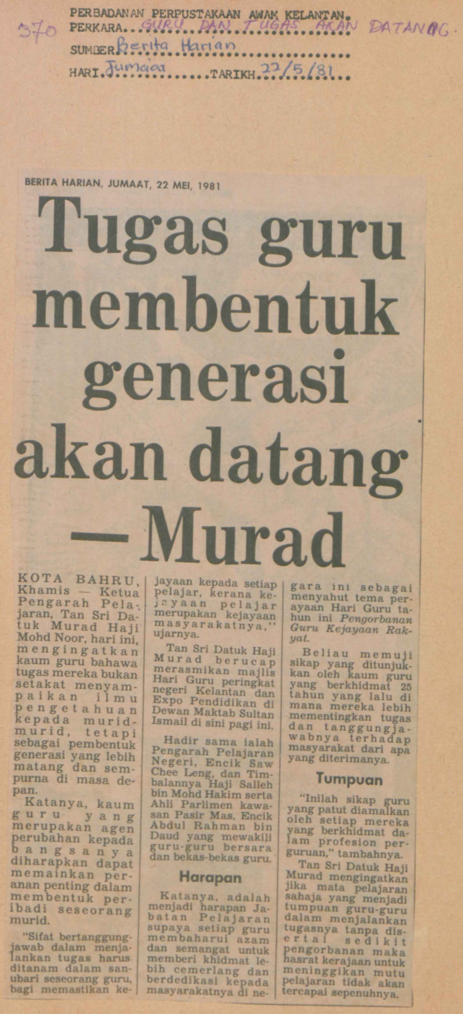 Berita Harian (1981) Tugas guru membentuk generasi akan datang-Murad. Berita Harian. |