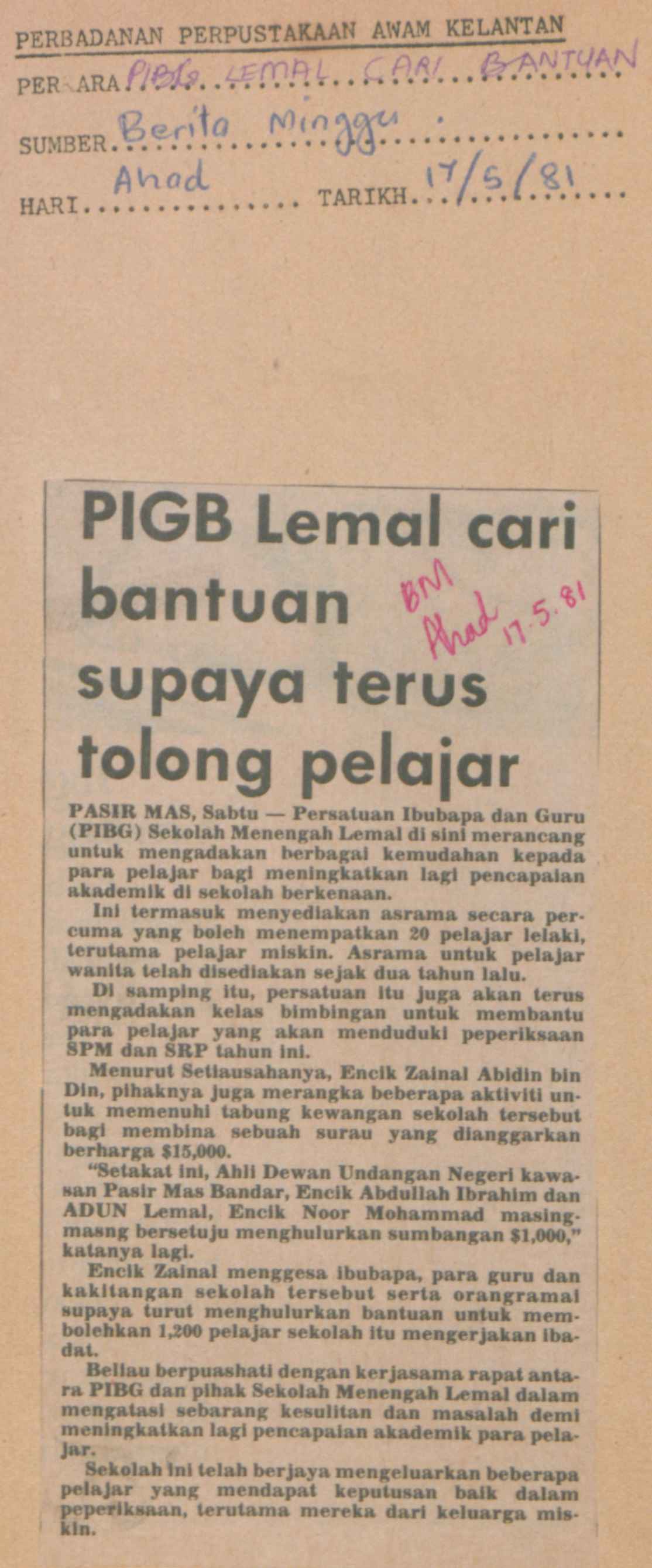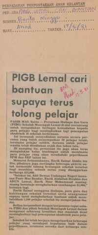 Berita Mingguan (1981) PIBG Lemal cari bantuan supaya terus tolong pelajar. Berita Mingguan. |
