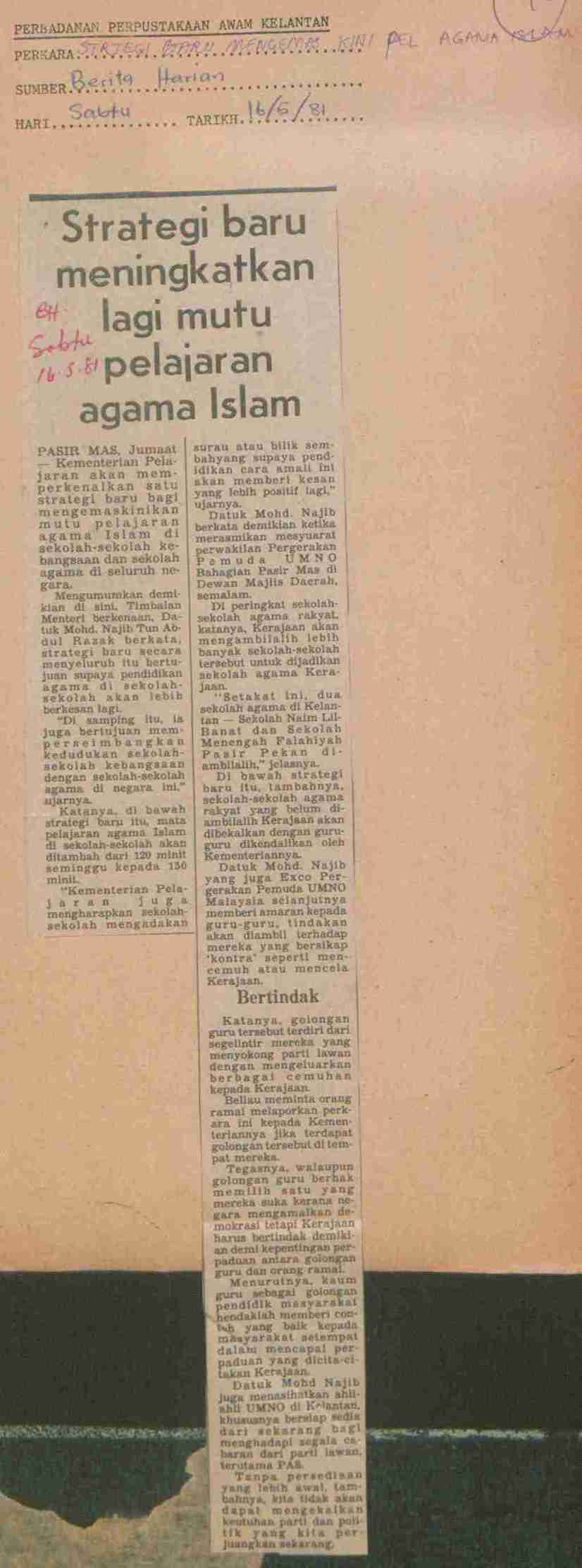 Berita Harian (1981) Strategi baru meningkatkan lagi mutu pelajaran agama islam. Berita Harian. |
