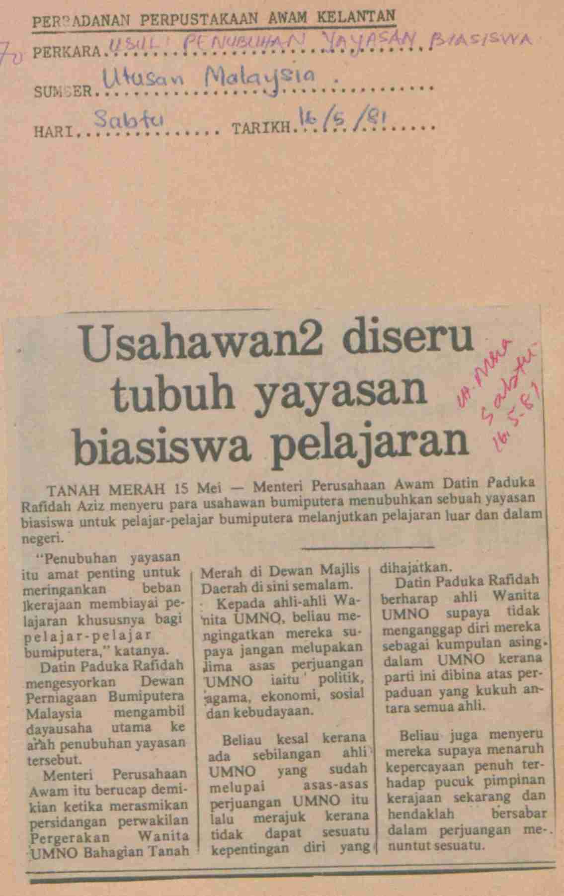 Utusan Malaysia (1981) Usahawan-usahawan diseru tubuh yayasan biasiswa pelajaran. Utusan Malaysia. |