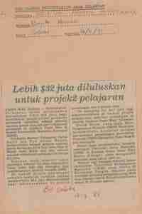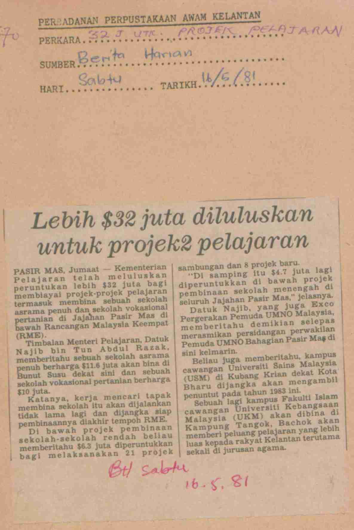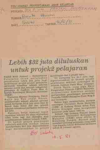 Berita Harian (1981) Lebih $32juta diluluskan untuk projek2 pelajaran. Berita Harian. |