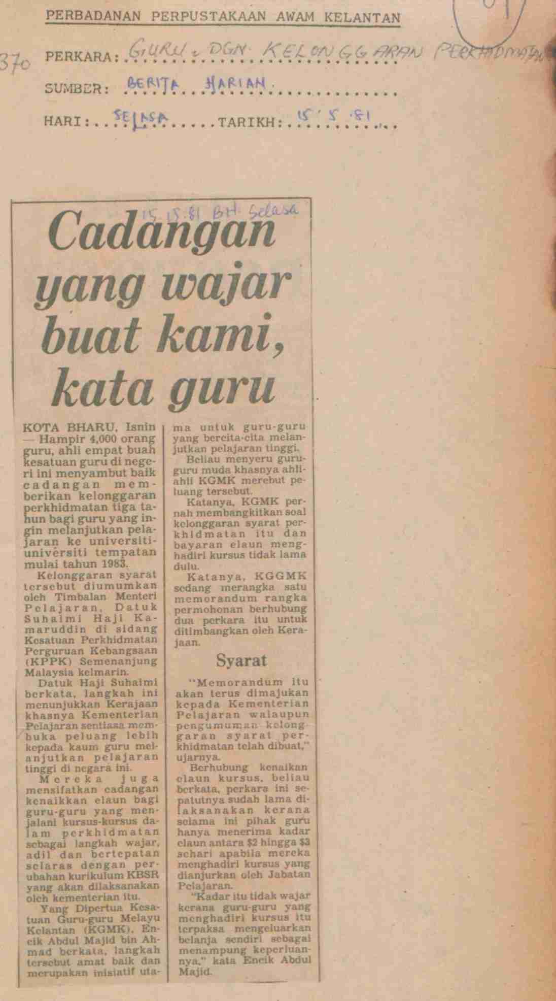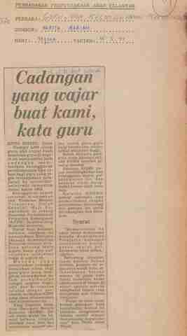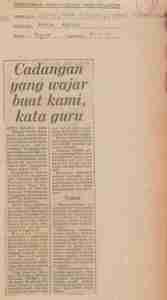 Berita Harian (1981) Cadangan yang wajar buat kami, kata guru. Berita Harian. |