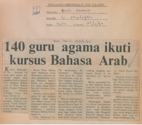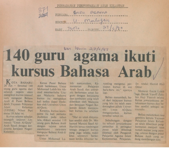 Utusan Malaysia (1983) 140 guru bahasa ikuti kursus bahasa arab. UNSPECIFIED. |