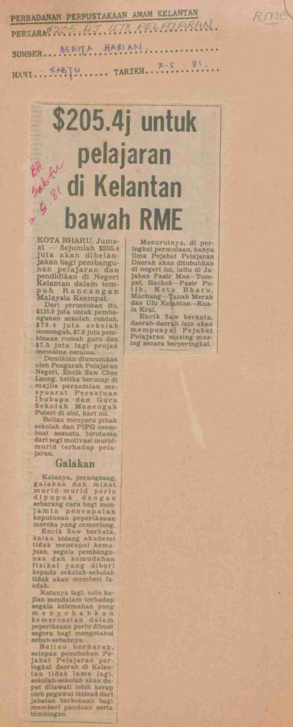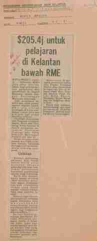 Berita Harian (1981) $205.4j untuk pelajaran di Kelantan bawah RME. Berita Harian. |