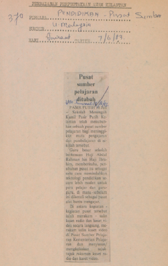 Utusan Malaysia (1983) Pusat sumber pelajaran ditubuh. UNSPECIFIED. |