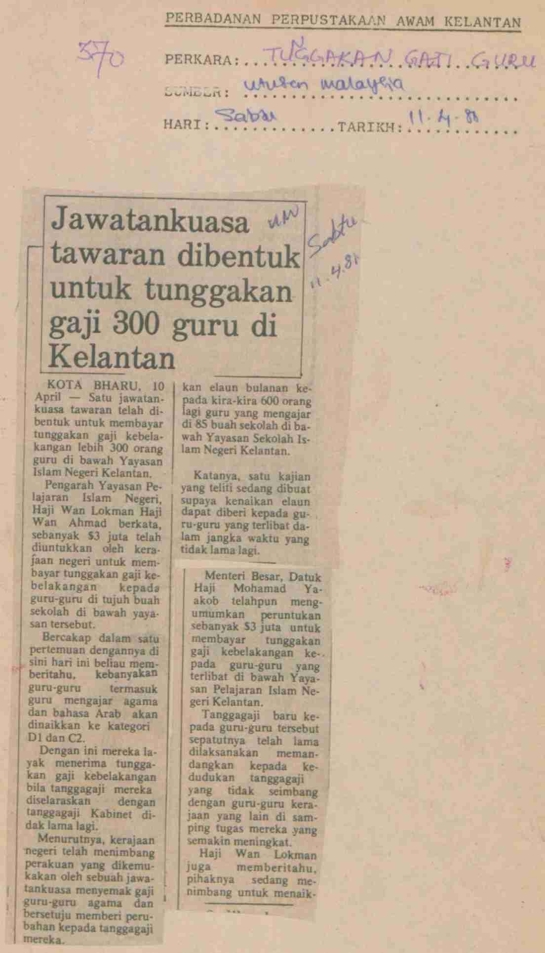 Utusan Malaysia (1981) Jawatankuasa tawaran dibentuk untuk tunggakan gaji 300 guru di Kelantan. Utusan Malaysia. |