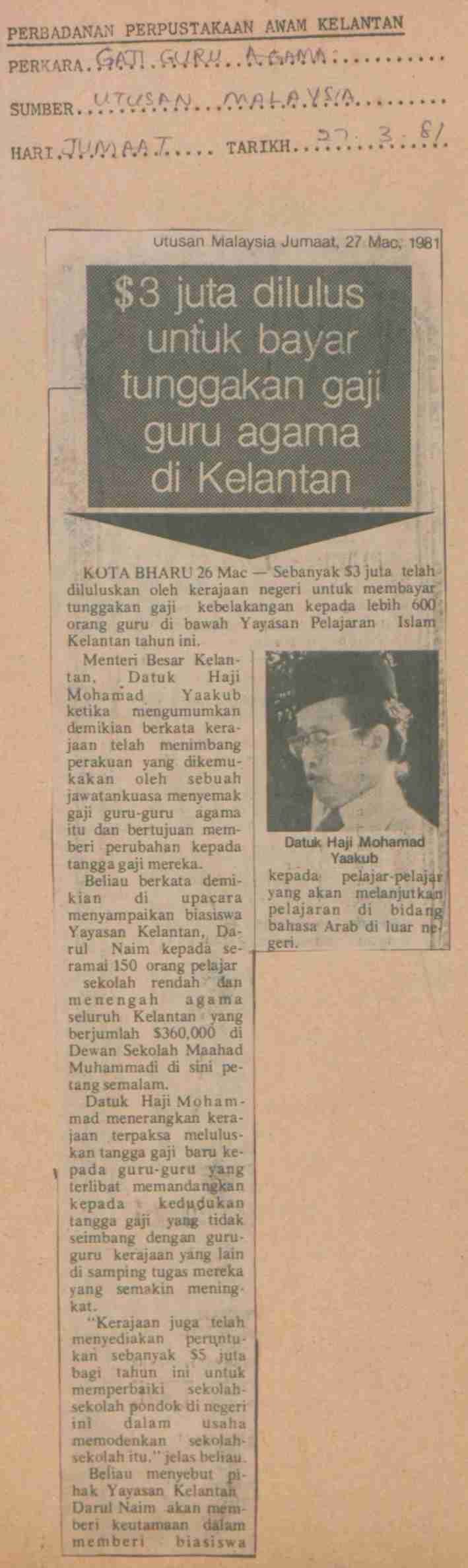 Utusan Malaysia (1981) $ 3 juta dilulus untuk bayar tunggakan gaji guru agama di Kelantan. Utusan Malaysia. |
