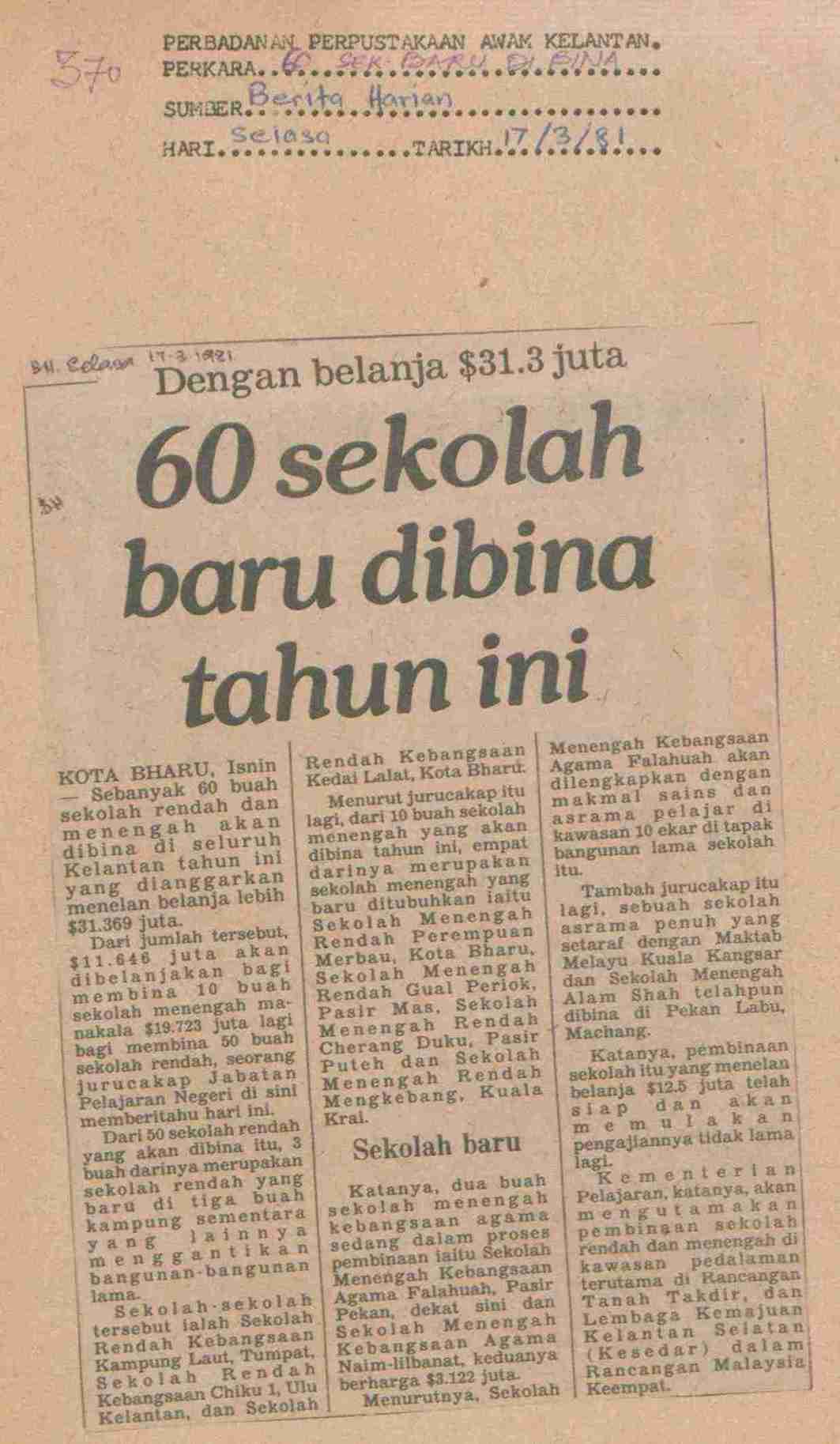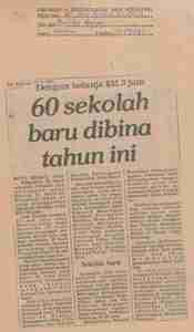 Berita Harian (1981) Dengan belanja $31.3juta 60 sekolah baru dibina tahun ini. Berita Harian. |