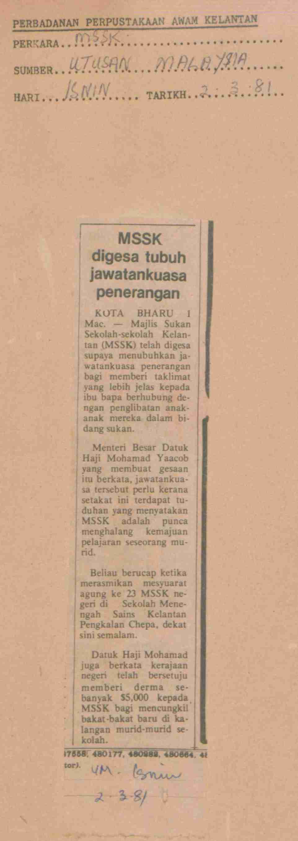 Utusan Malaysia (1981) MSSK digesa tubuh jawatankuasa penerangan. Utusan Malaysia. |