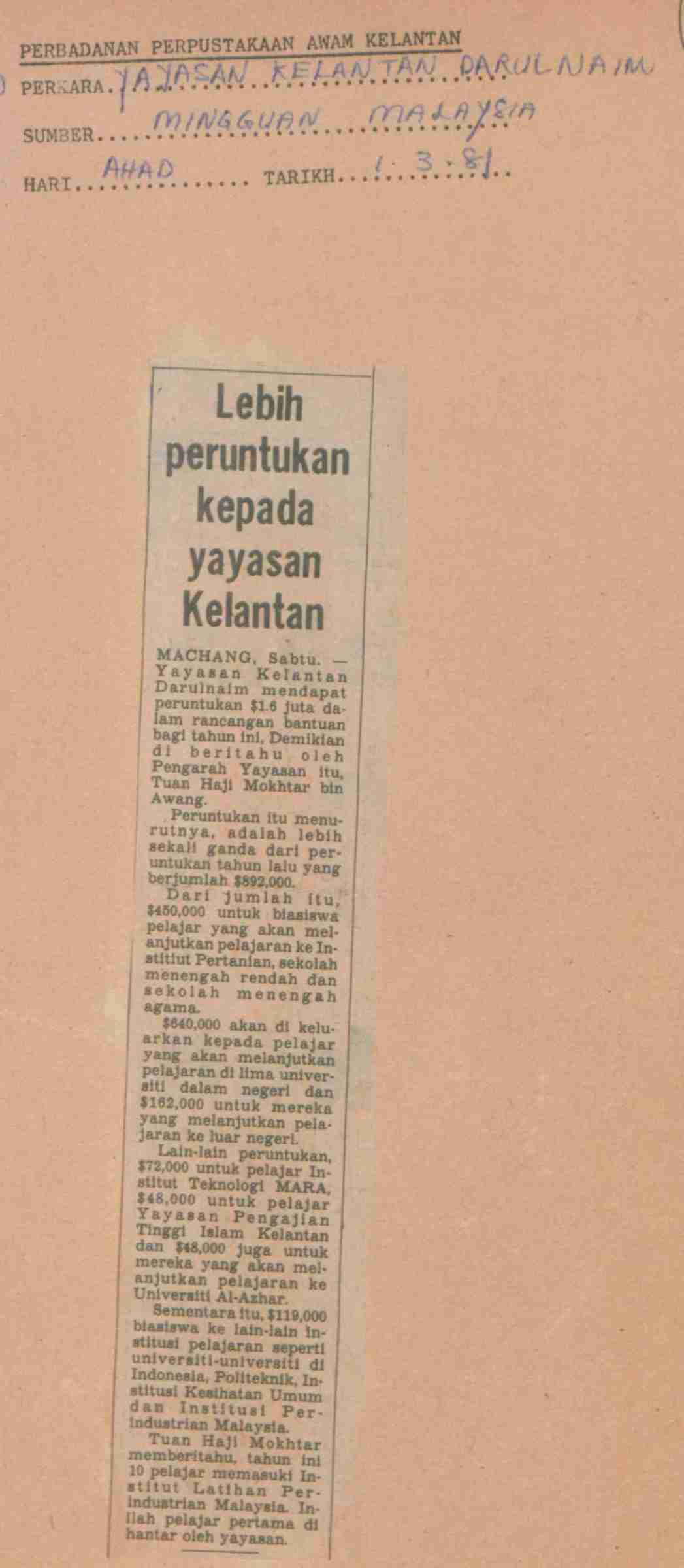 Mingguan Malaysia (1981) Lebih peruntukan kepada yayasan Kelantan. Mingguan Malaysia. |