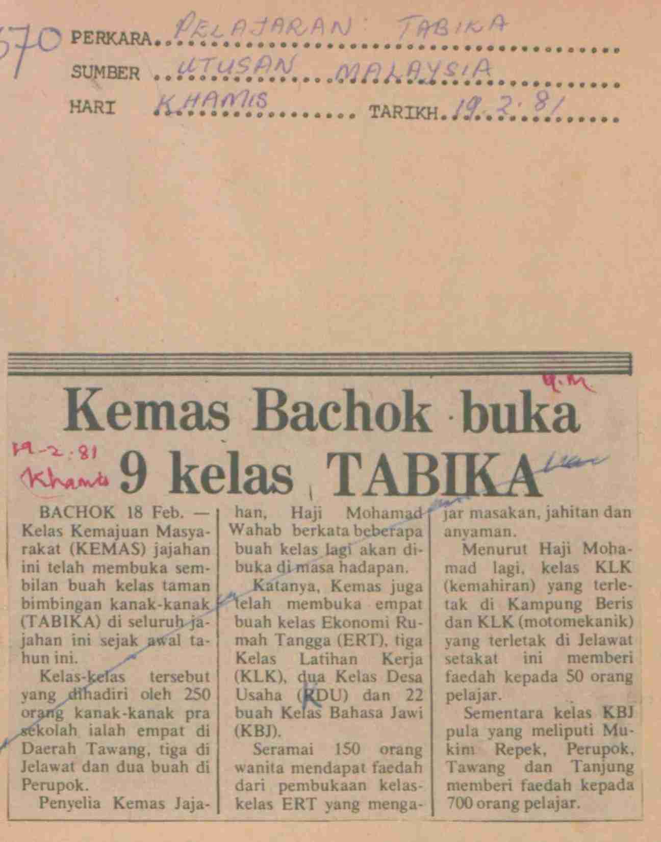 Utusan Malaysia (1981) Kemas Bachok buka 9 kelas TABIKA. Utusan Malaysia. |