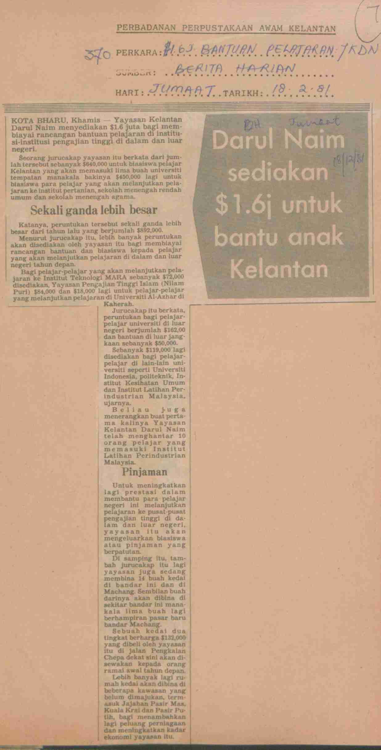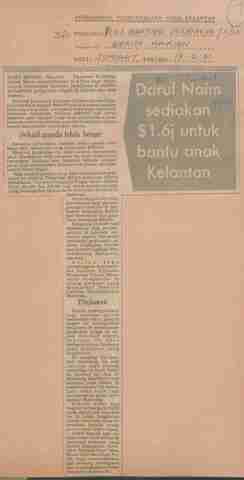 Berita Harian (1981) Darul Naim sediakan $1.6j untuk bantu anak Kelantan. Berita Harian. |