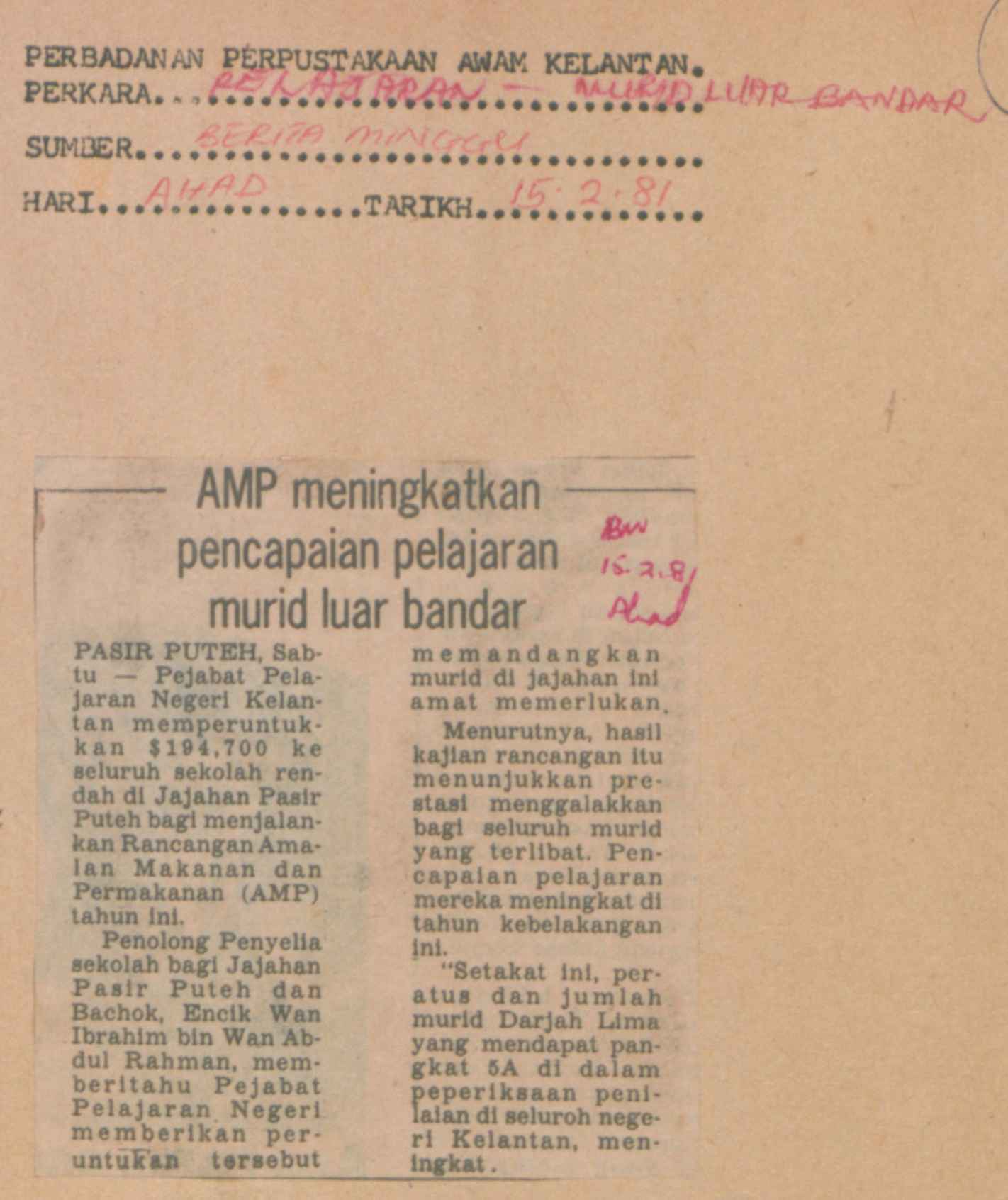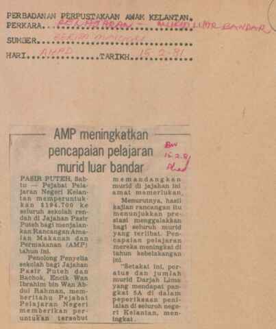 Berita Mingguan (1981) AMP meningkatkan pencapaian pelajaran murid luar bandar. Berita Mingguan. |