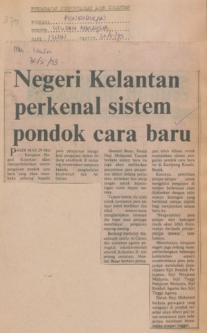 Utusan Malaysia (1983) Negeri Kelantan perkenal sistem pondok cara baru. UNSPECIFIED. |