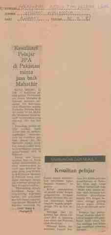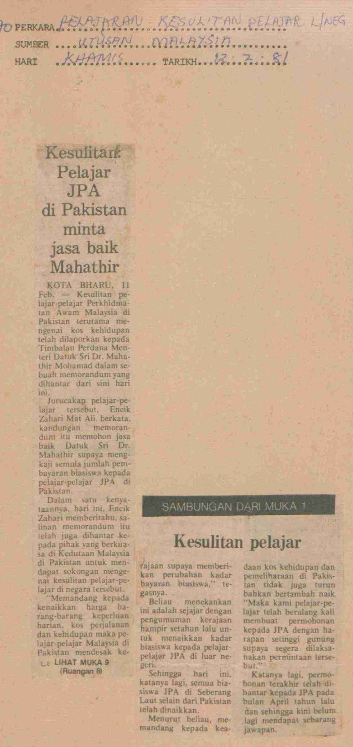 Utusan Malaysia (1981) Kesulitan: Pelajar JPA di Pakistan minta jasa baik-Mahathir. Utusan Malaysia. |