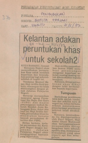 Berita Harian (1983) Kelantan adakan peruntukan khas untuk sekolah2. UNSPECIFIED. |